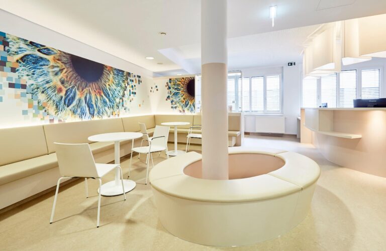 Im Wartebereich bietet eine Mischung aus Sitzbänken und Stühlen ausreichende Flexibilität für die Patienten, um Distanz zueinander zu wahren. Genügend Ablagemöglichkeiten für Zeitschriften und persönliche Utensilien sorgen für Ordnung.